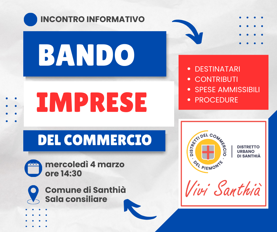 Il 4 marzo 2026 alle ore 14:30, presso la sala consiliare del Comune di Santhià, sarà presentato il nuovo Bando Imprese del Distretto del Commercio Vivi Santhià.